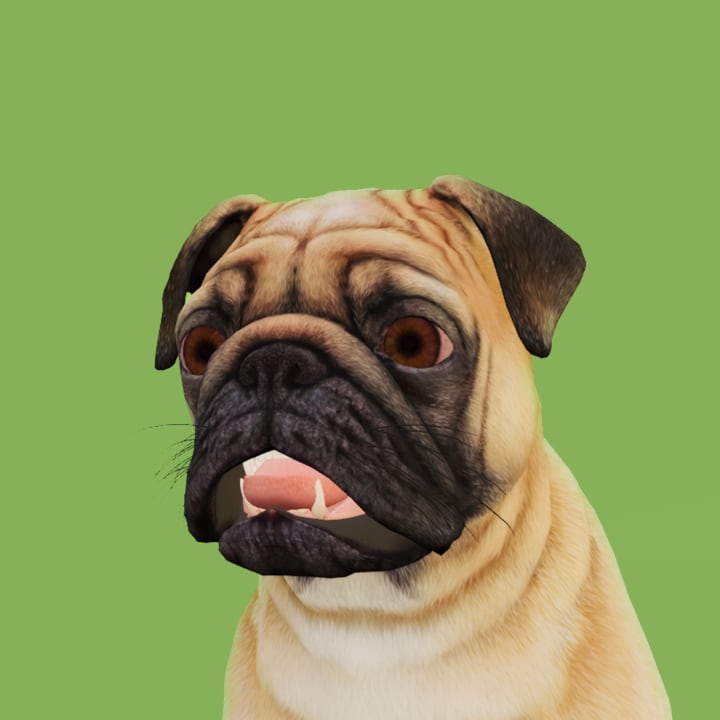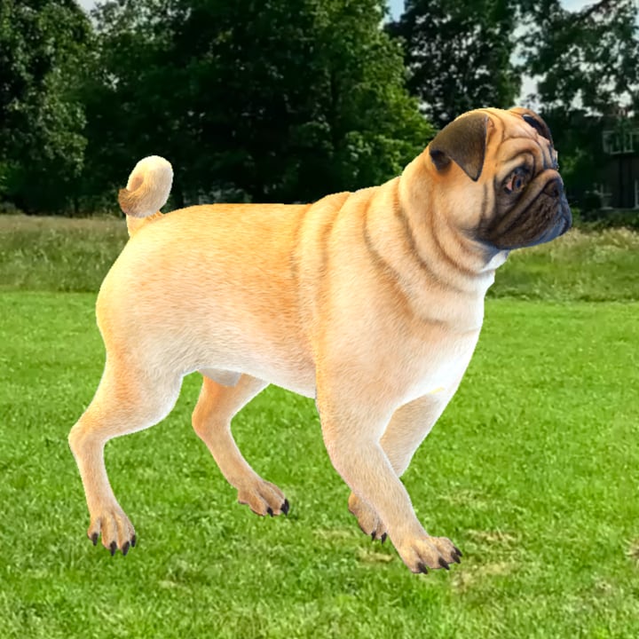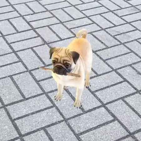 Puggy is a virtual pet. As a dog, it likes playing fetch. The AR pug is allergy-friendly and free of genetic problems. Adopt it today!