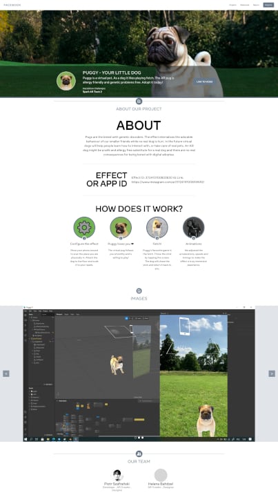In our small team, I was responsible for programming, design, and text creation. The virtual pug follows the owner smoothly and is willing to play fetch. We adjusted the accelerations, speeds, and timings to make the augmented reality effect a truly immersive experience. Puggy was created using Spark AR.